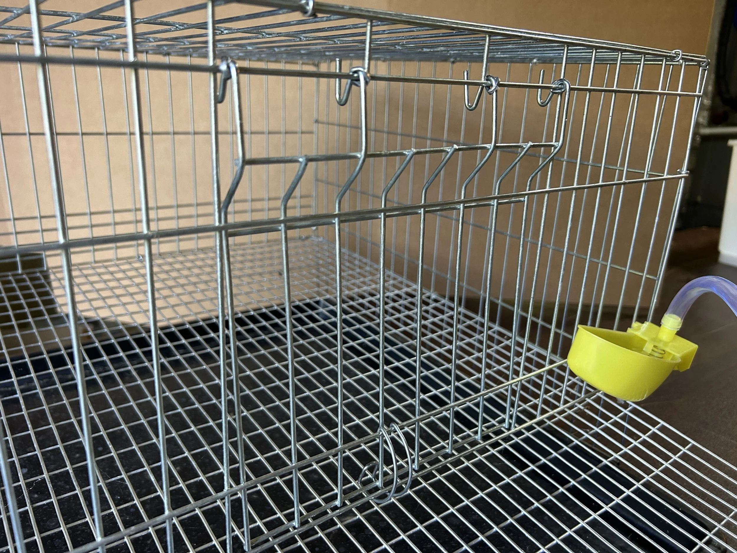 Use the screws to attach the water cups on either side of each cage section. There are cups for the left and right sides. Be sure the spring is set correctly and that the cup can move freely.